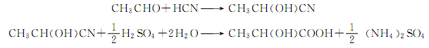 將乙醛和冷的氫氰酸連續(xù)送入反應器生成乳腈,再用泵壓入水解釜,并加入水和硫酸催化水解得乳酸;加乙醇酯化后精餾分出乳酸乙酯;后送入濃縮罐加熱分解而得精乳酸。